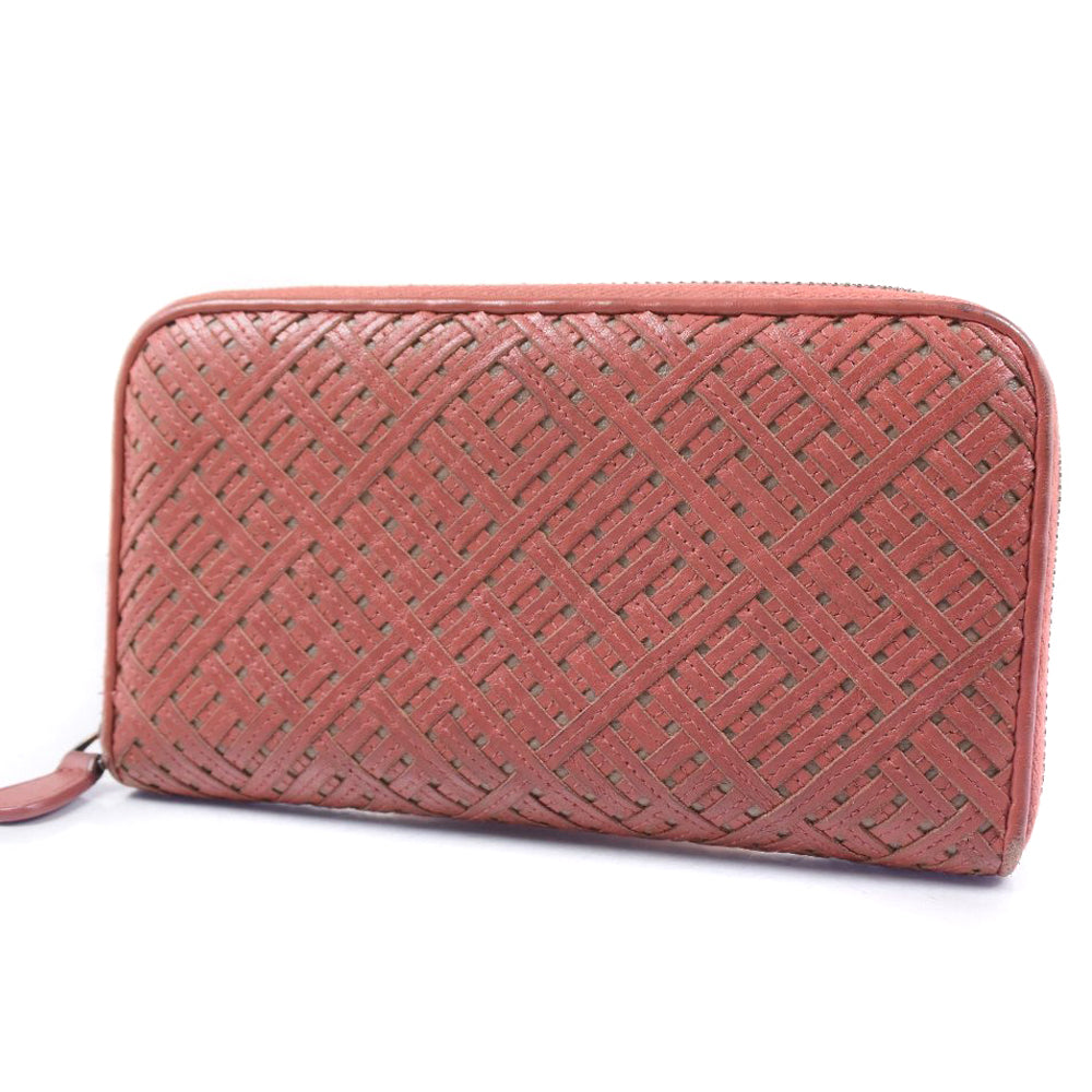 BOTTEGAVENETA Long Wallet Purse lambskin Red tea INTRECCIATO Zip Around Women Used Authentic