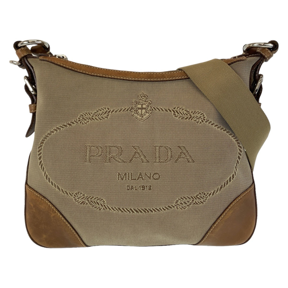 PRADA Shoulder Bag Canvas, Leather Beige Brown Gold Metal Shoulder Bag Hobo Logo jacquard Women Used Authentic