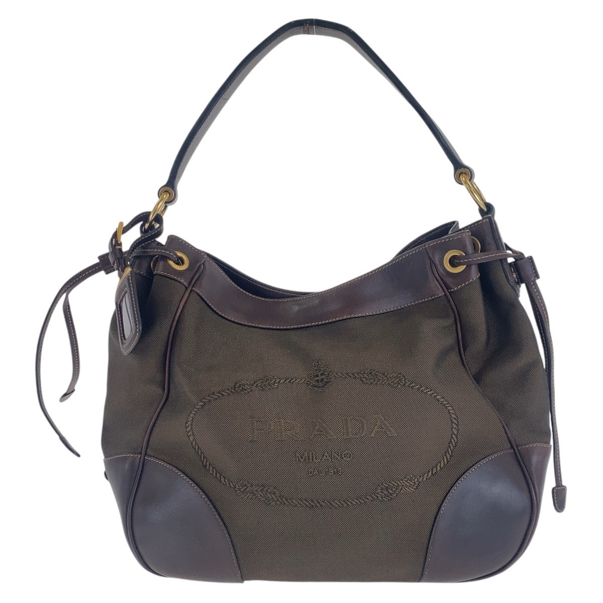 PRADA Shoulder Bag canvas Beige Ivory Gold Metal Shoulder Bag Messenger bag Logo jacquard Women Used Authentic