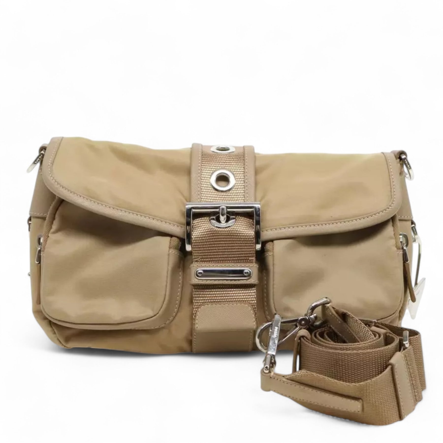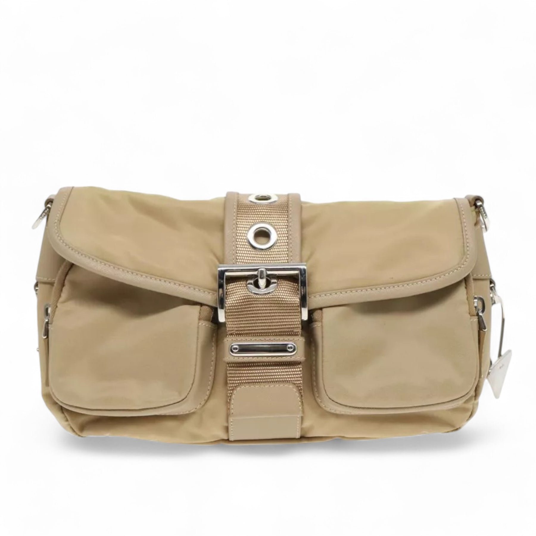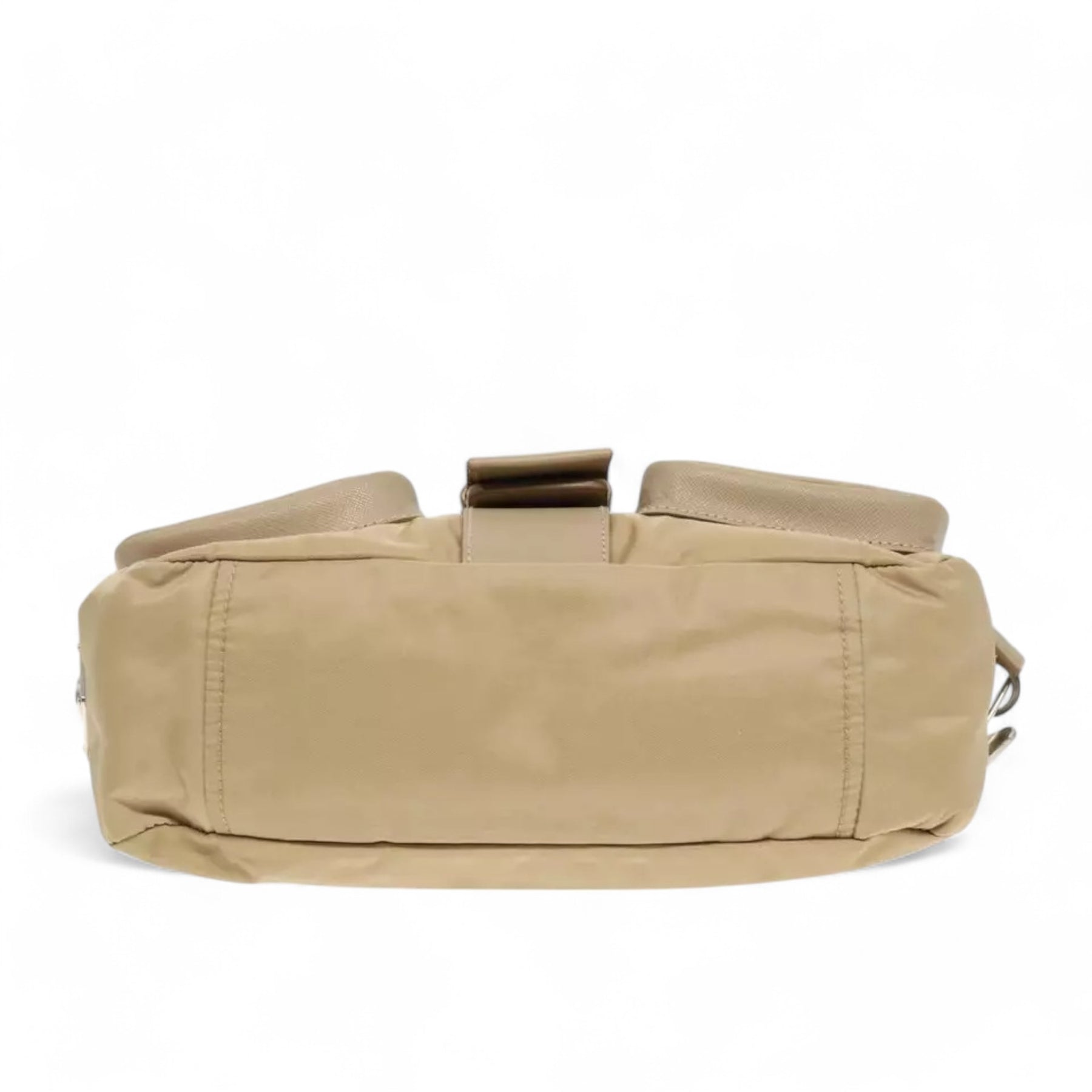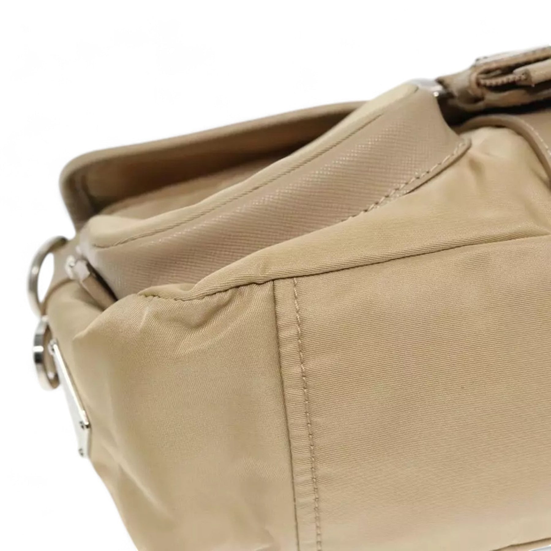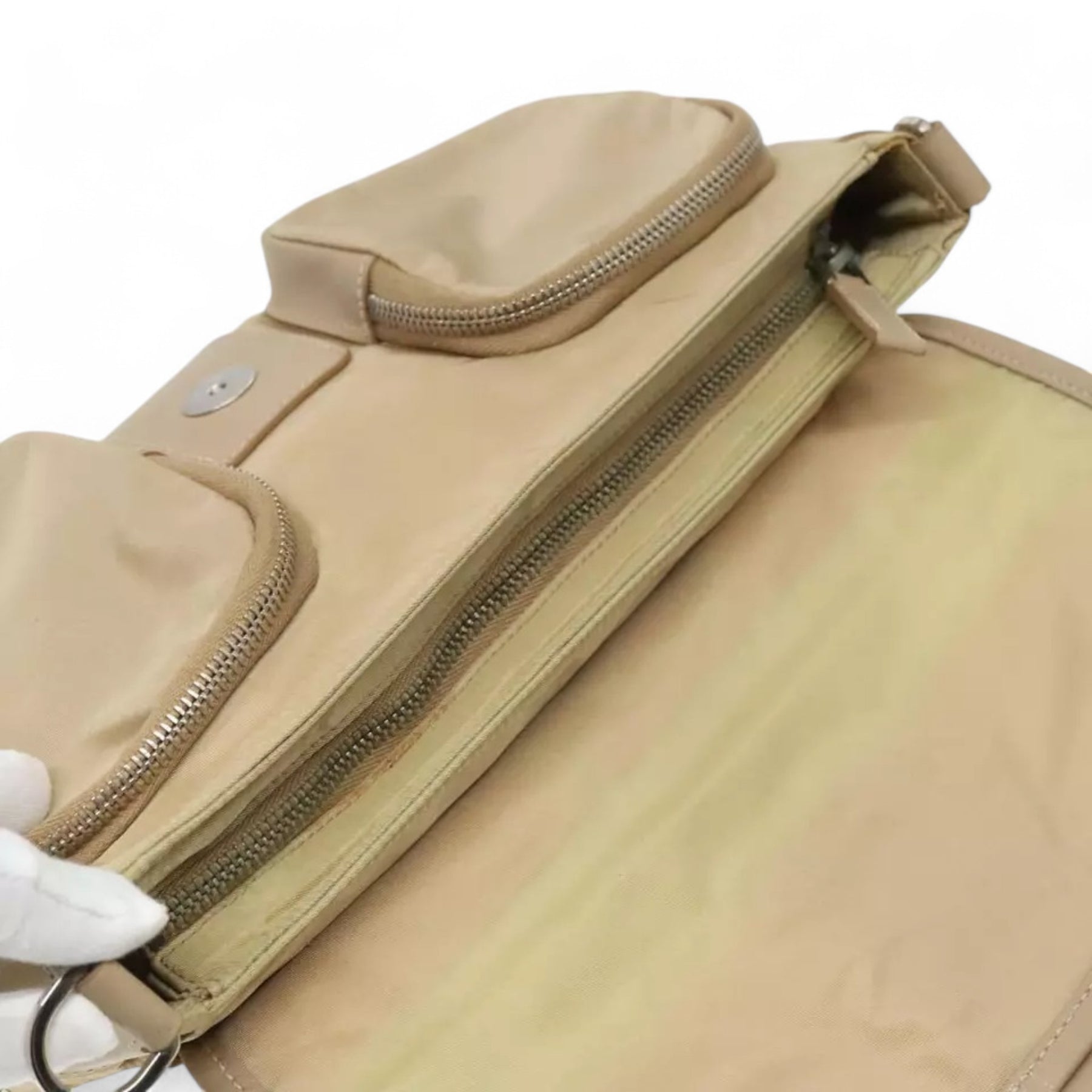 Condition - Color transfer, shape loss, rubbing, and fading on surface. Partly stained and rubbing on leather. Partly stained, rubbing, and deformation on shoulder strap. Slight rust and scratches on metal fittings. Slight stain, rubbing, and partly dirt on inside. Slight stain and rubbing on pocket. Rubbing on corner. Storage smell.