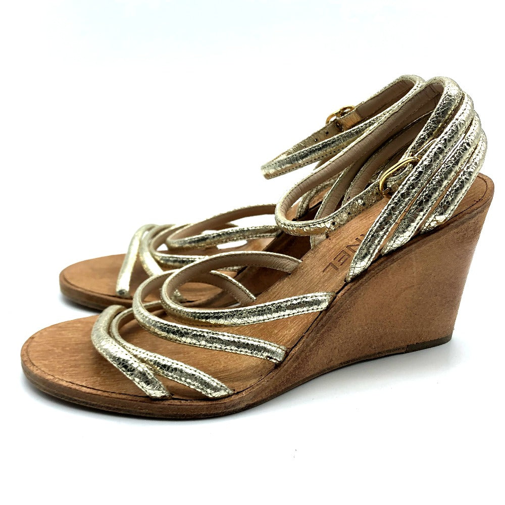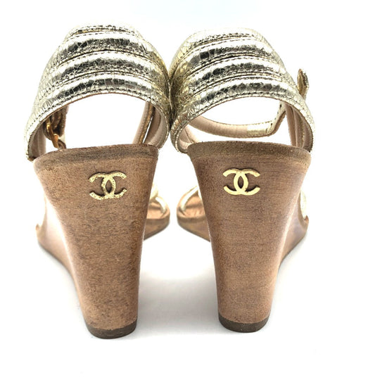 CHANEL Sandals leather Champagne Gold CC COCO Mark Wood sole Women 36 1/2C Used Authentic