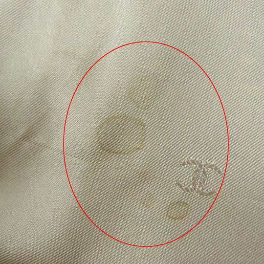 There are some loose threads on the lining of the jacket, some light rubbed stains on the cuffs, and some stains under the arms. (See image) There are some stains on the lining of the skirt. (See image)