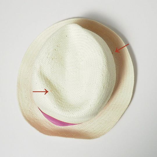 There is a small amount of dirt near the top and on the brim. (Please see the arrows in the photo.) There is no dirt or damage that would interfere with the product and it is in good condition.