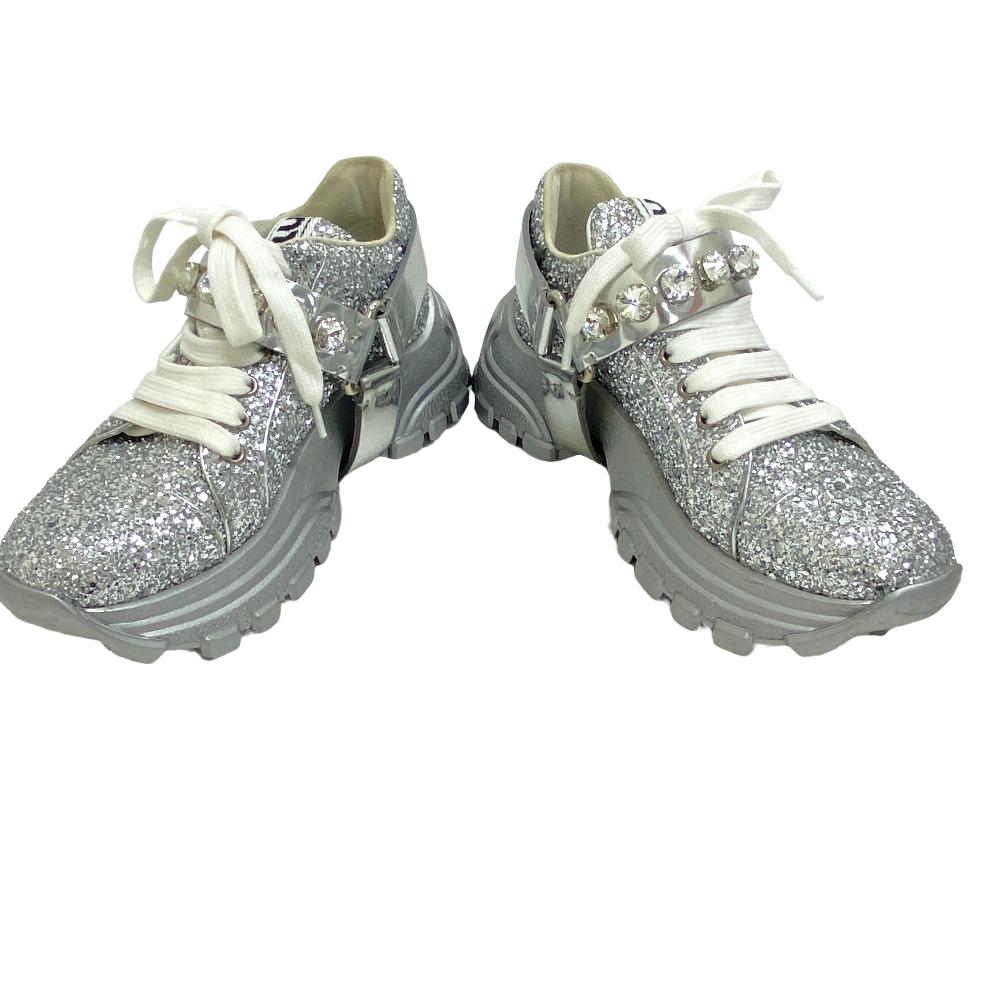MIUMIU sneakers leather Silver Glitter Bijoux Women 35 1/2 Used Authentic