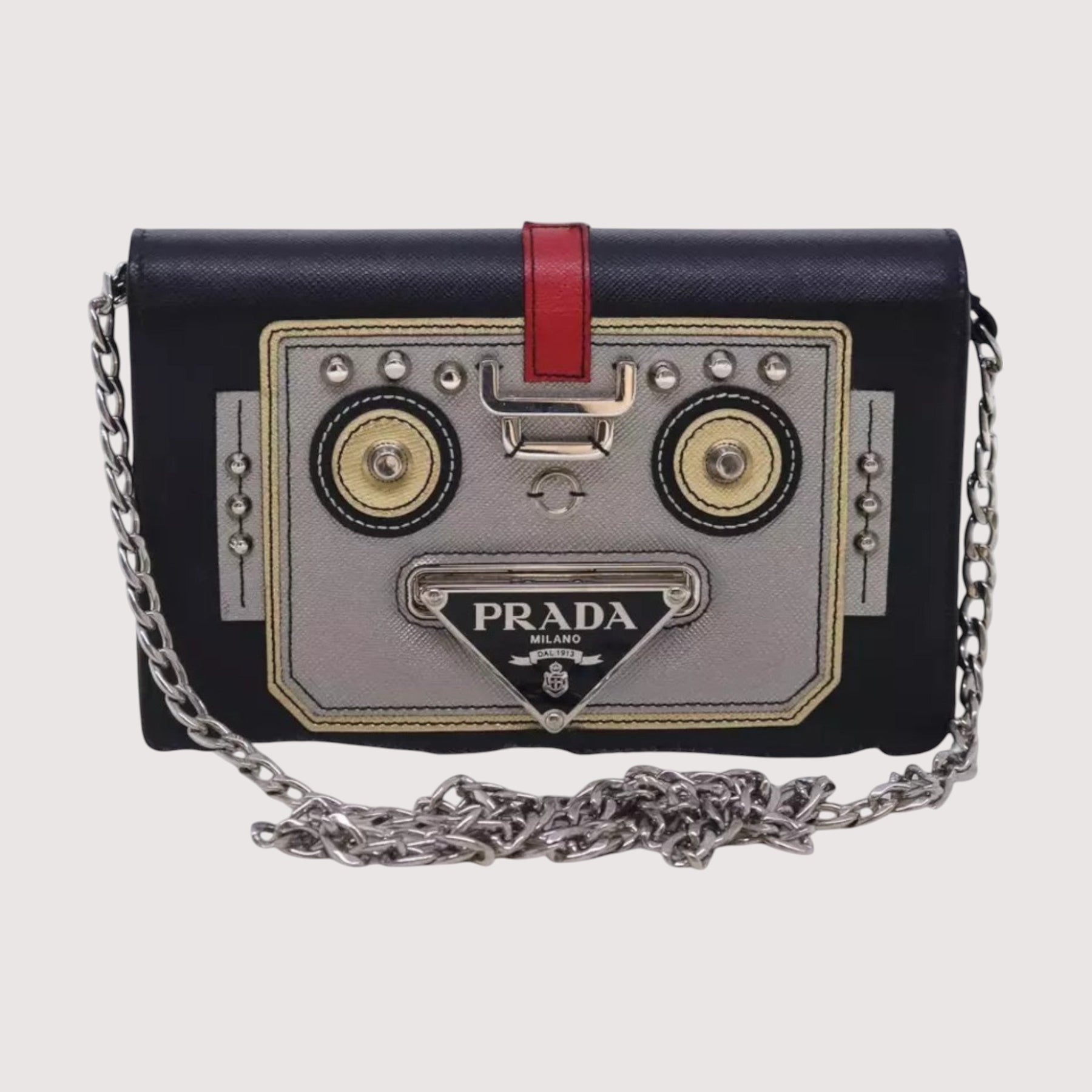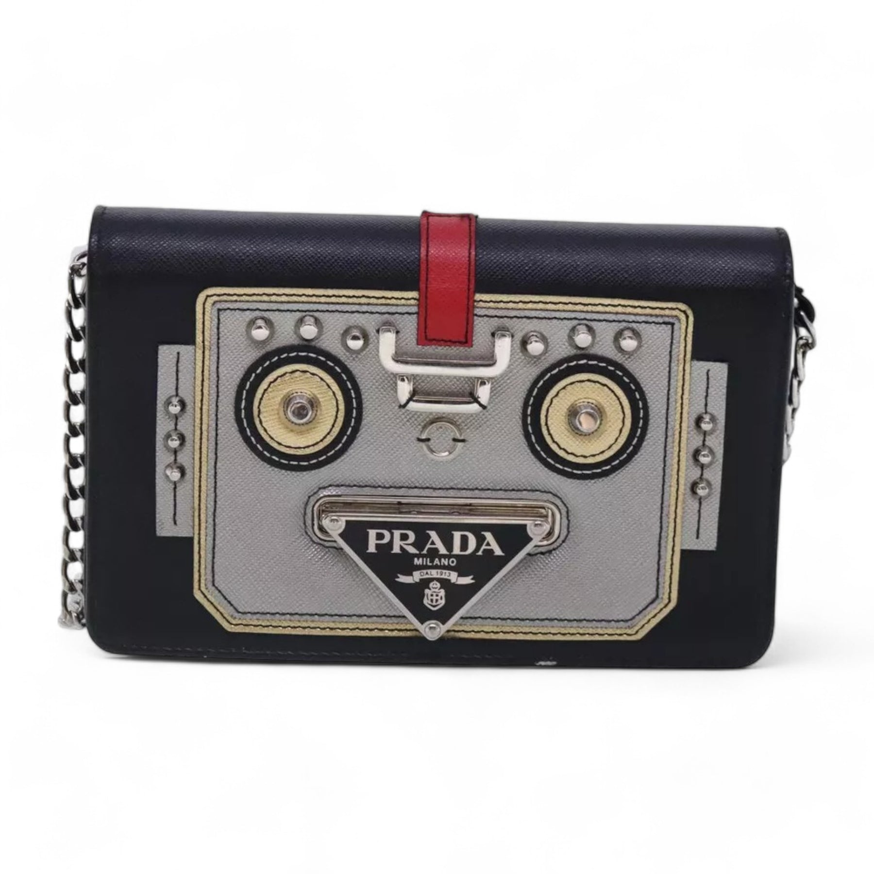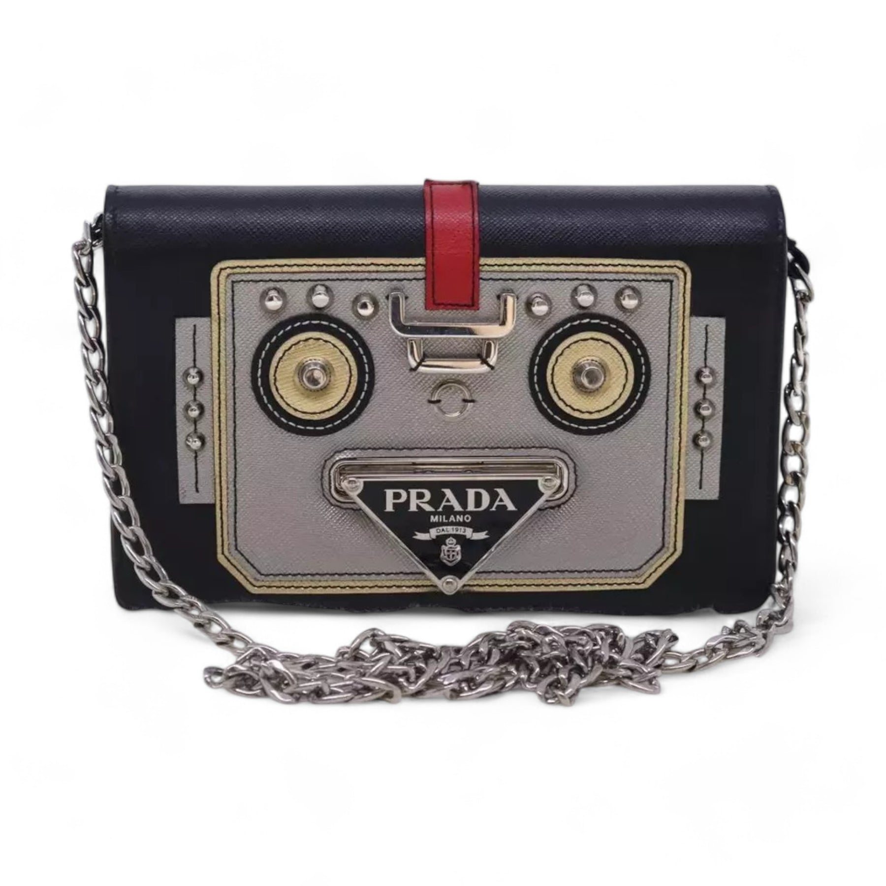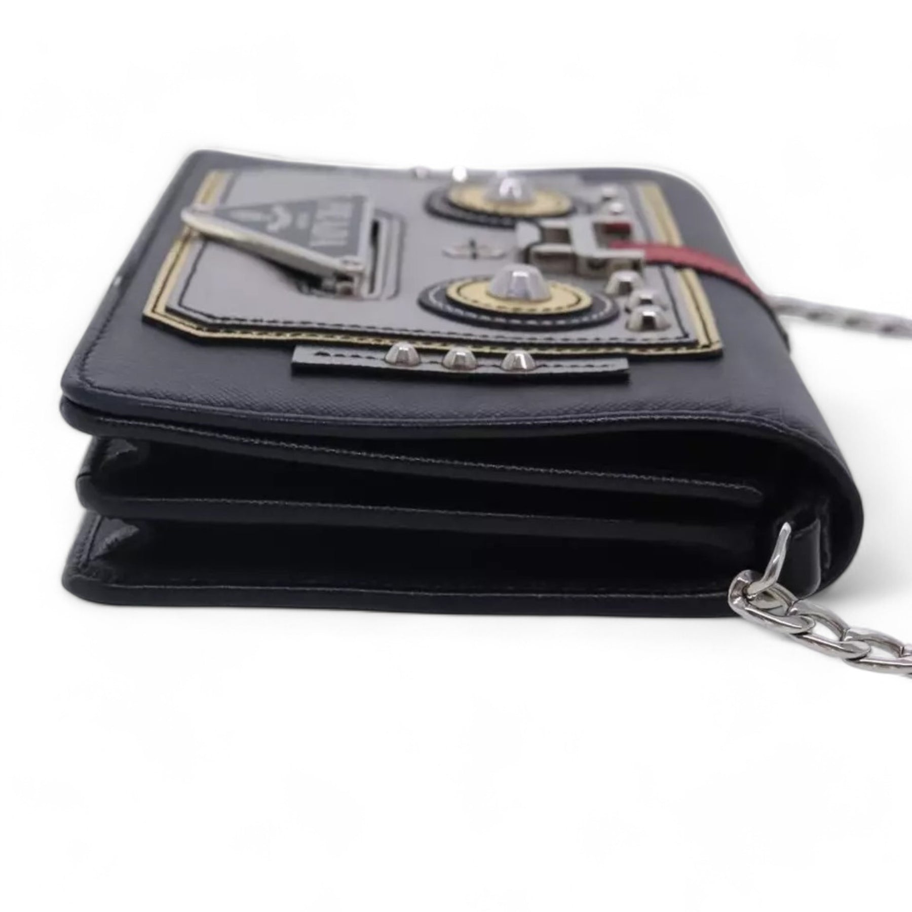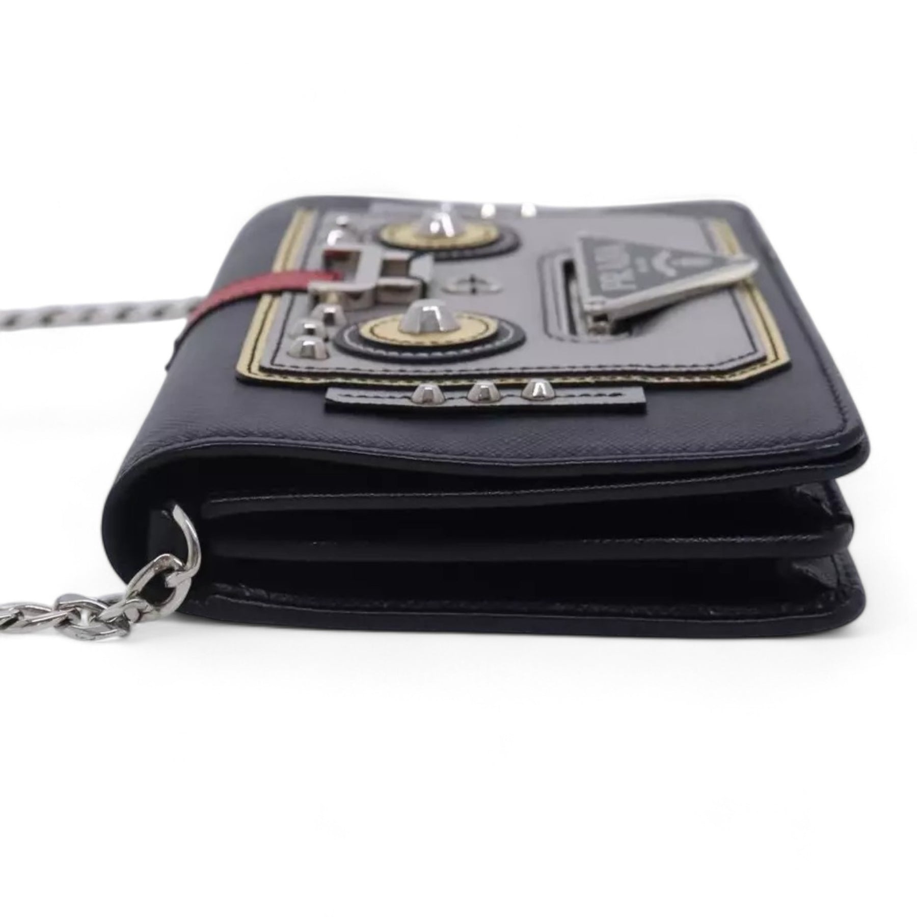 Prada Chain Shoulder Bag Saffiano Leather Black Silver Women