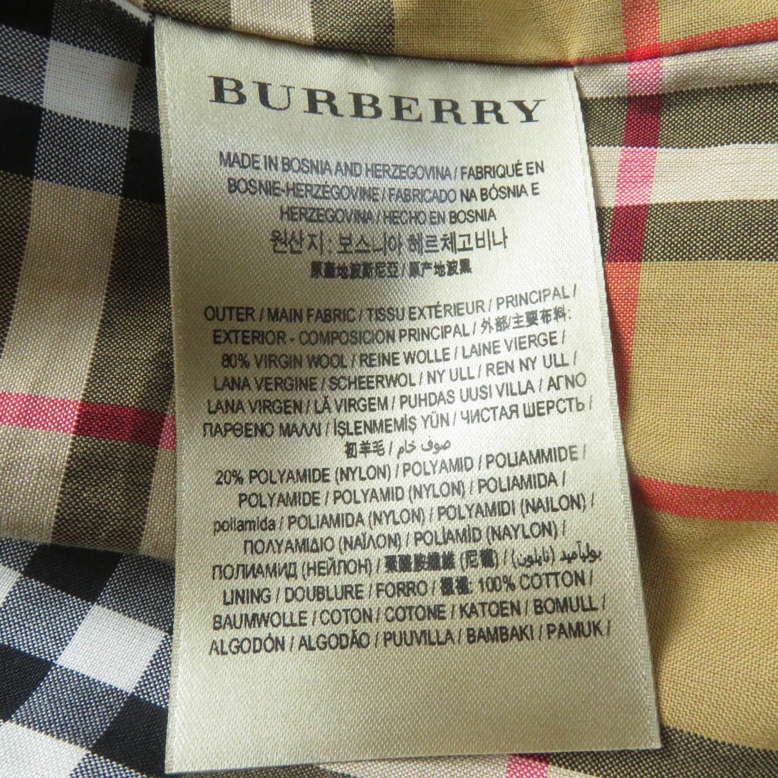 Material Main: 80% virgin wool, Main: 20% nylon, Lining: 100% cotton, Sleeve lining: 100% viscose (rayon)