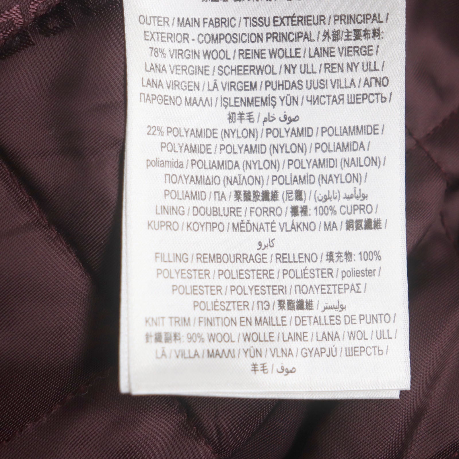 Material Outer material: 78% wool, Outer material: 22% nylon, Outer material: 100% cowhide, Filling: 100% polyester, Lining: 100% rayon