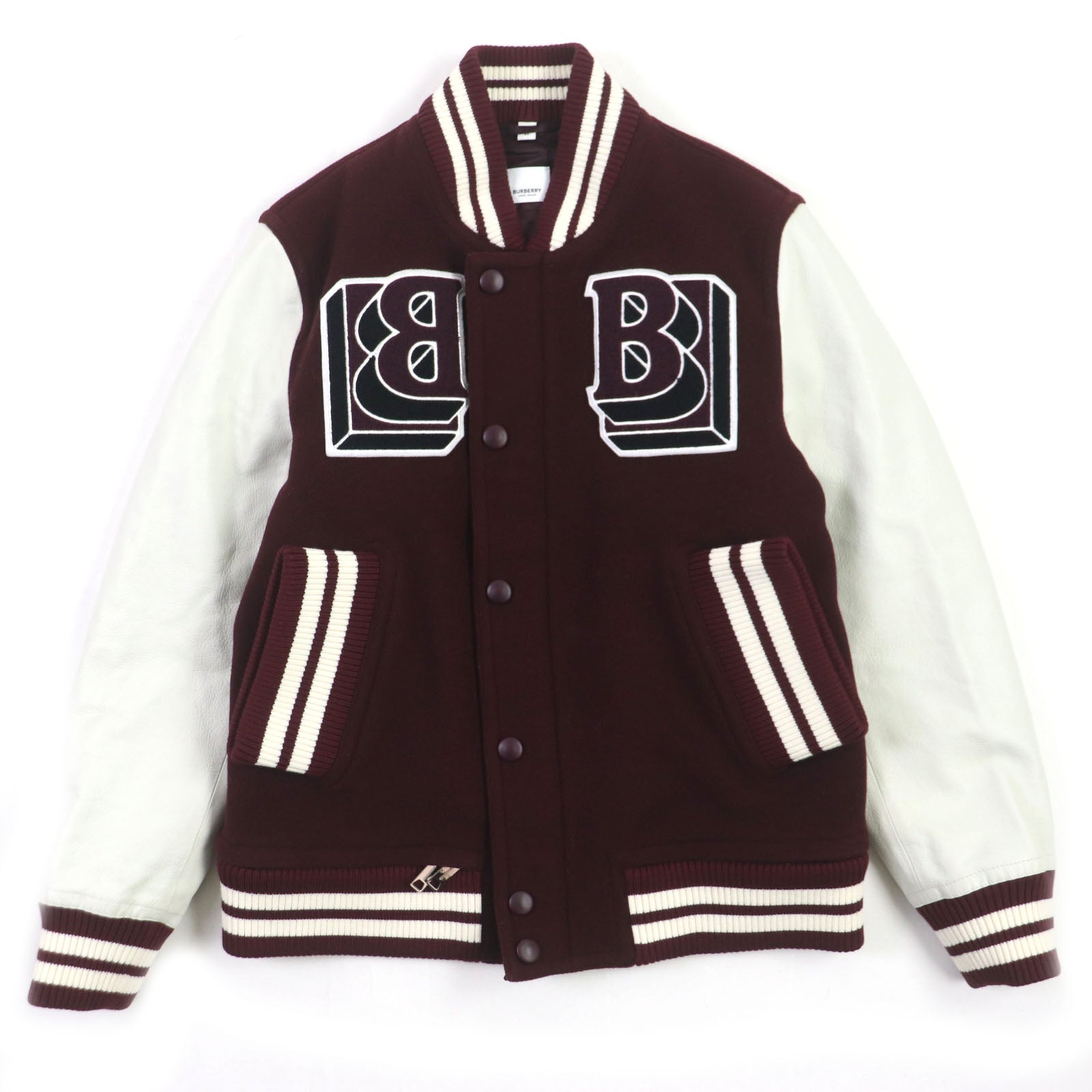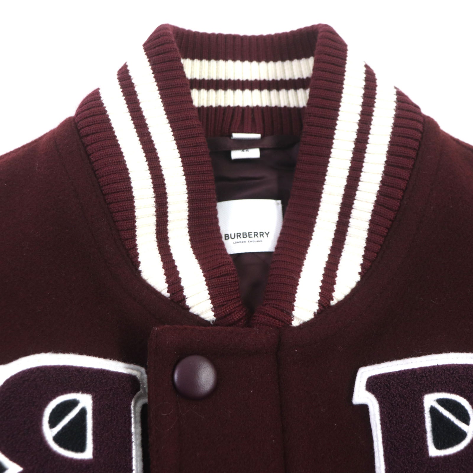 BURBERRY Stajan 8045532 Outer material: 78% wool, Outer material: 22% nylon, Outer material: 100% cowhide, Filling: 100% polyester, Lining: 100% rayon Burgundy White logo-patch varsity jacket mens 46 Used Authentic