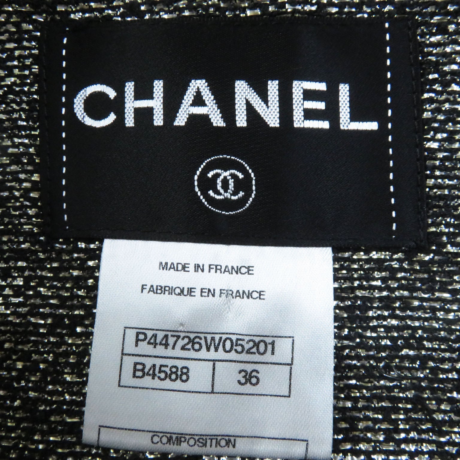 CHANEL No color jacket P44726 Outer: 96% rayon, Outer: 4% polyurethane, Lining: 44% polyester, Lining: 39% nylon, Lining: 17% cotton black Women 36 Used Authentic