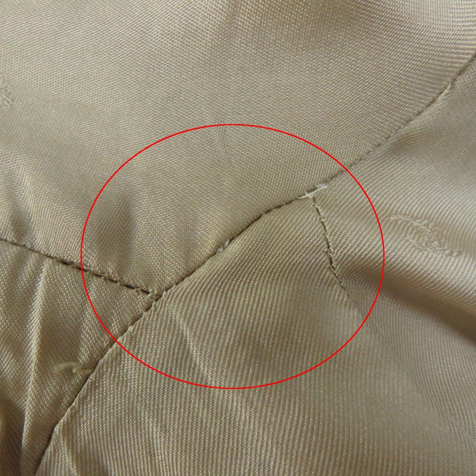 There are some loose threads on the lining of the jacket, some light rubbed stains on the cuffs, and some stains under the arms. (See image) There are some stains on the lining of the skirt. (See image)