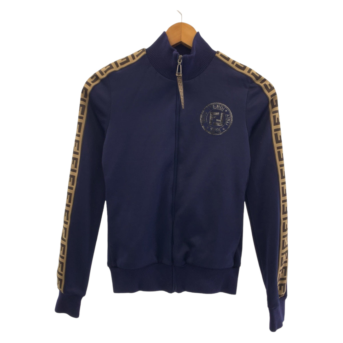 FENDI Jersey FAF069 ADH8 polyester Navy Brown SilverMetal Track jacket jersey Zucca Pattern Side line Women 36 Used Authentic