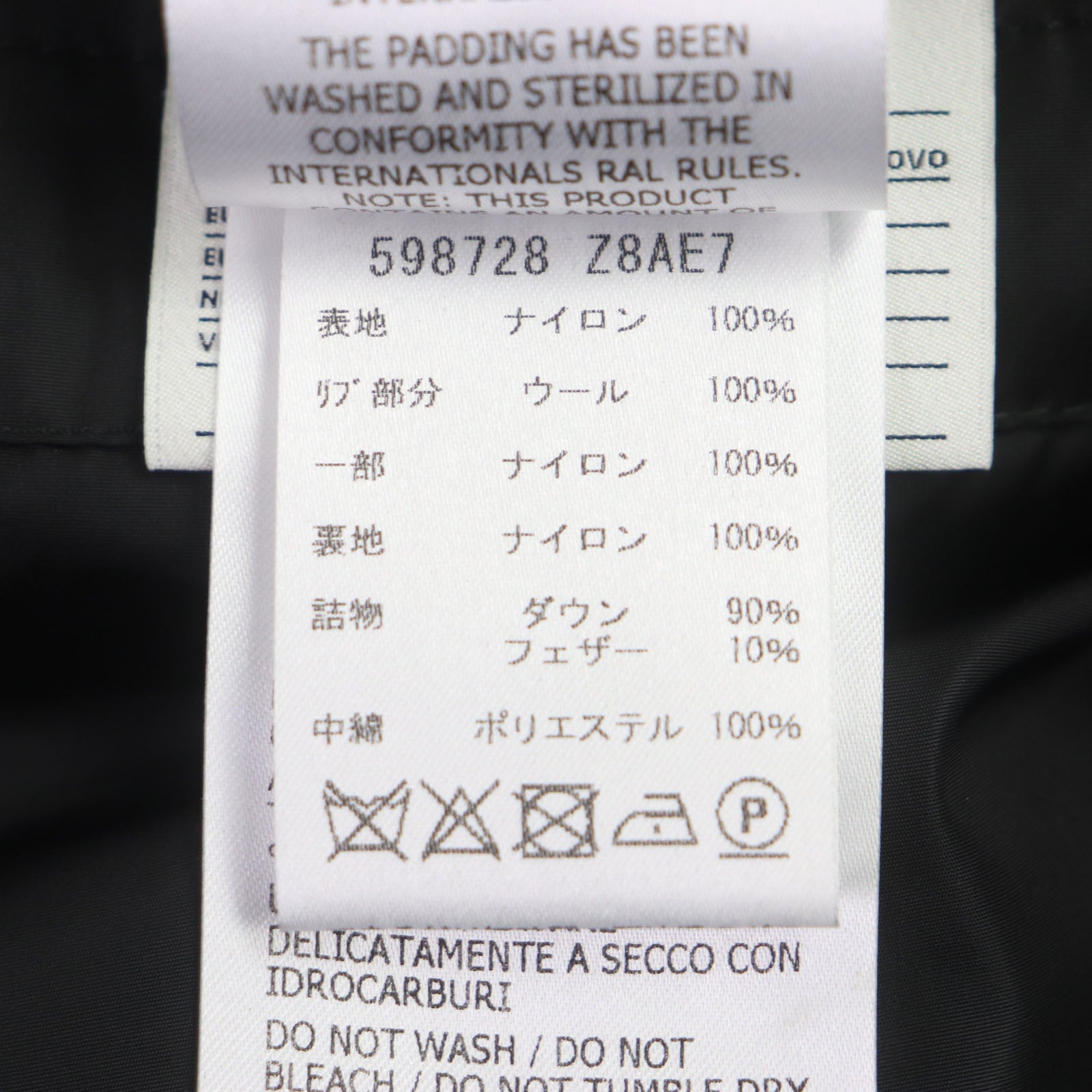 Material Outer: 100% nylon, Part: 100% nylon, Lining: 100% nylon, Filling: 100% polyester, Rib part: 100% wool, Filling: 90% down, 10% feather