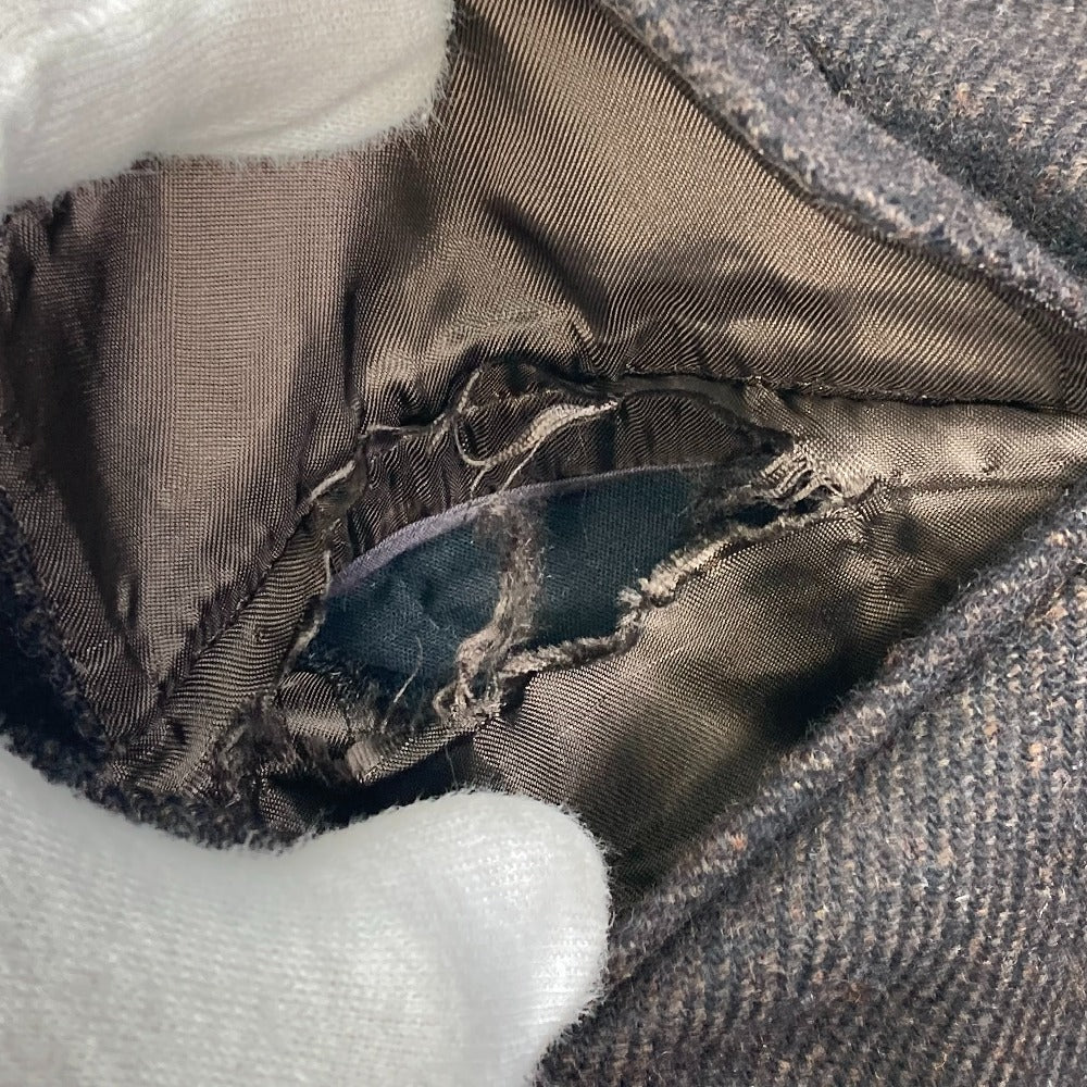 Quality tag attached, brand tag attached, surface fluffing, torn and frayed threads inside pocket.
