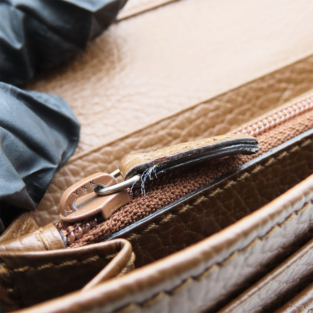 Remark Details:Some rubbed and stained inner , some stained coin pocket , some creases on zipper pull , peeling and fluffing on edges