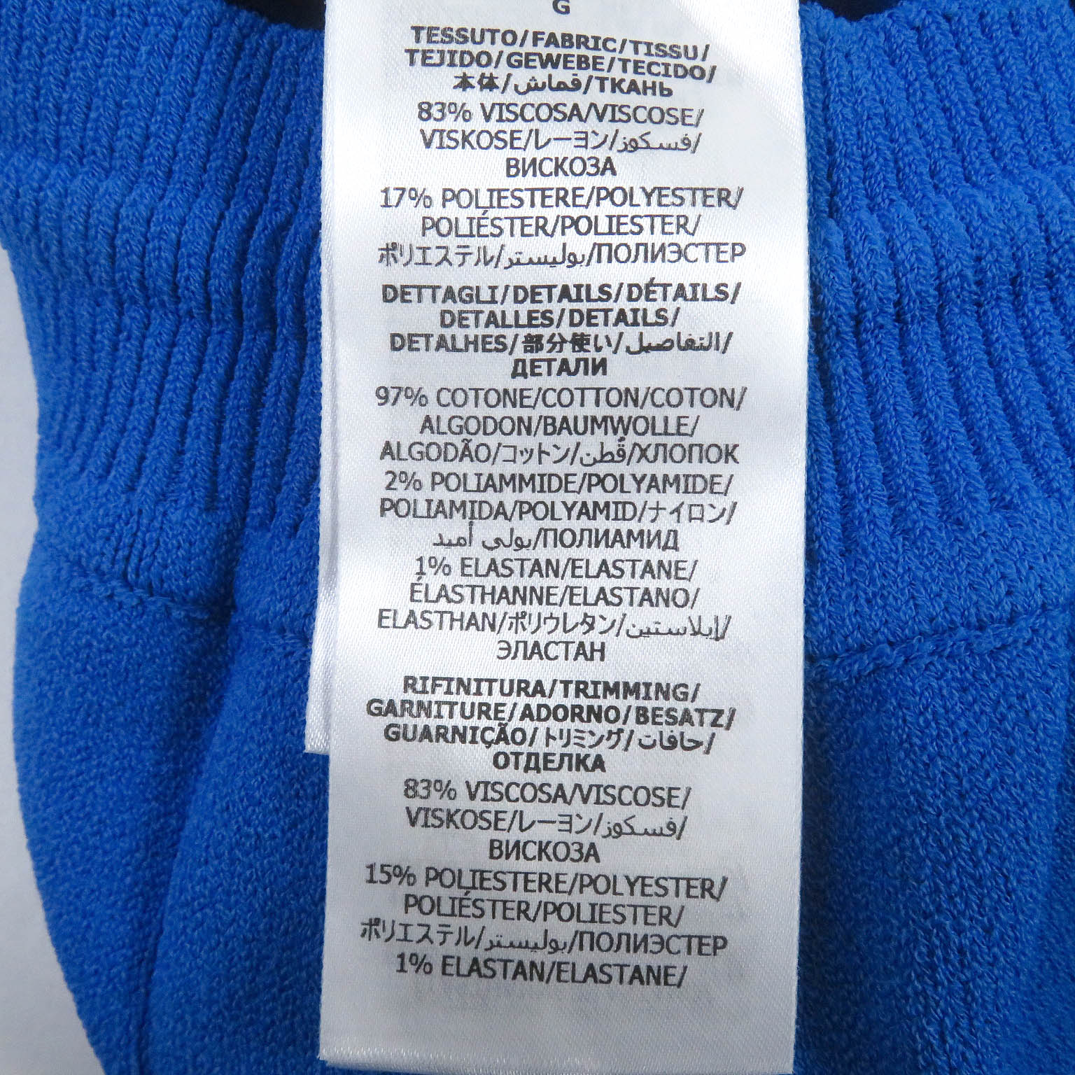 Material Main: 83% rayon, Main: 17% polyester, Parts: 97% cotton, 2% nylon, 1% polyurethane, Trim: 83% rayon, 15% polyester, 1% elastane