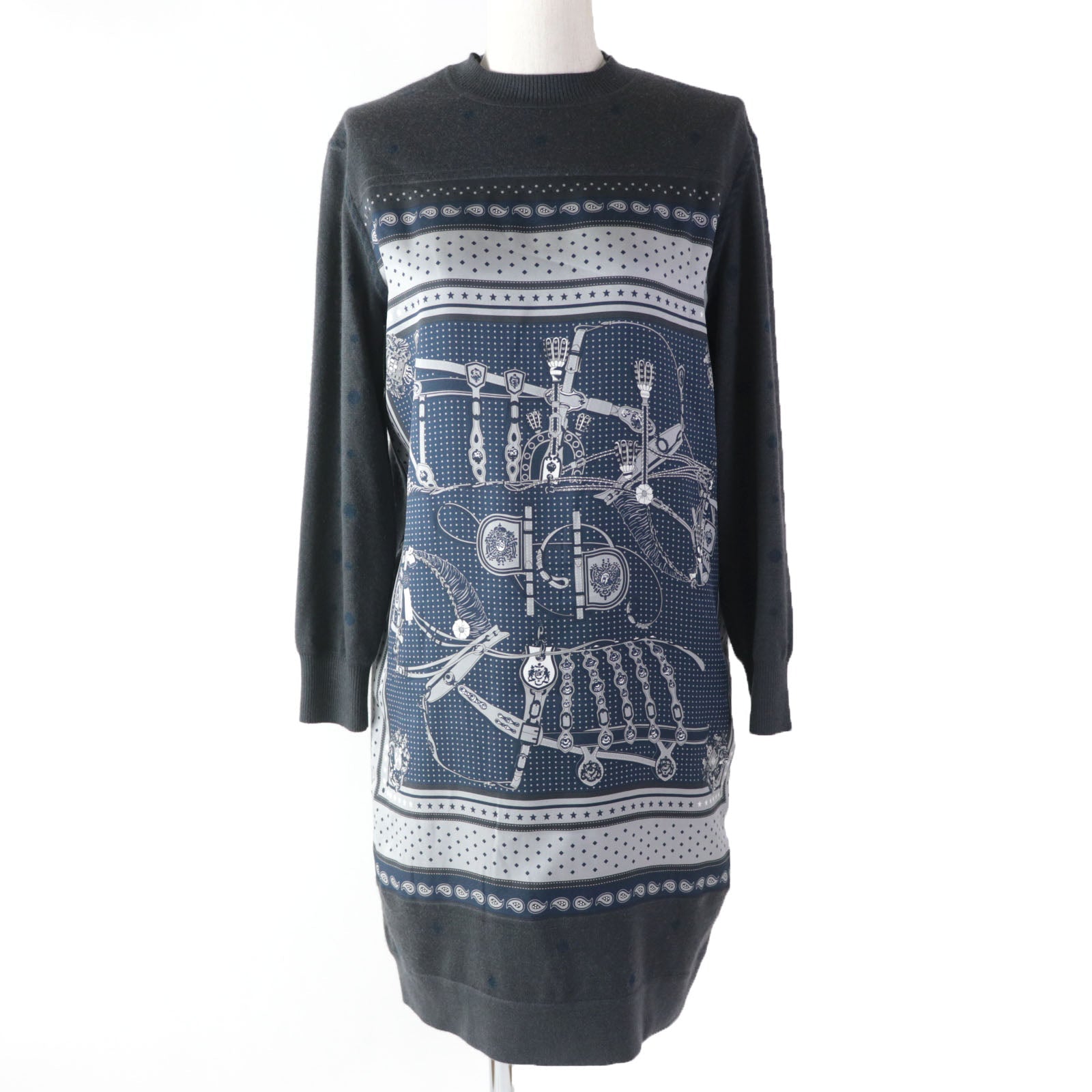 HERMES one piece 2H2825DS Main: 100% silk, Main: 50% cashmere, Main: 50% silk, Part: 48% cashmere, Part: 48% silk, : 3% nylon, 1% polyurethane, Embroidery: 100% polyester gray HARNAIS DE COUR Court harness Women 34 Used Authentic