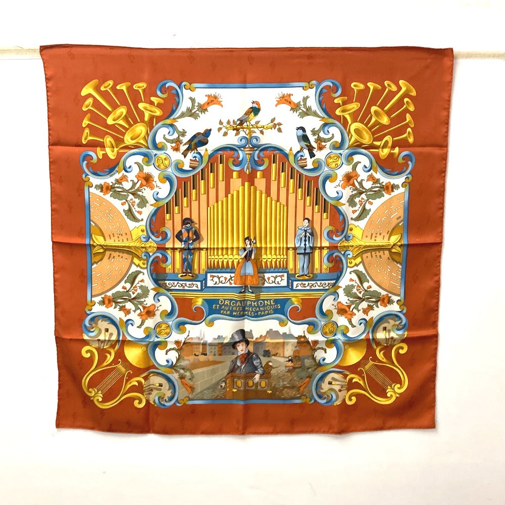 HERMES scarf silk Orange Carre90 ORGAUPHONE AND MECHANIQUES Pipe organ and clockwork instruments