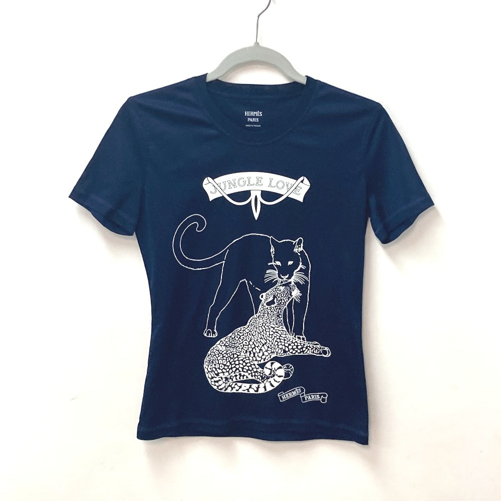 HERMES Short sleeve T-shirt cotton Navy leopard leopard leopard Jungle Love logo Women 34 Used Authentic