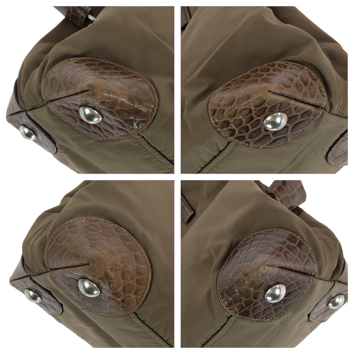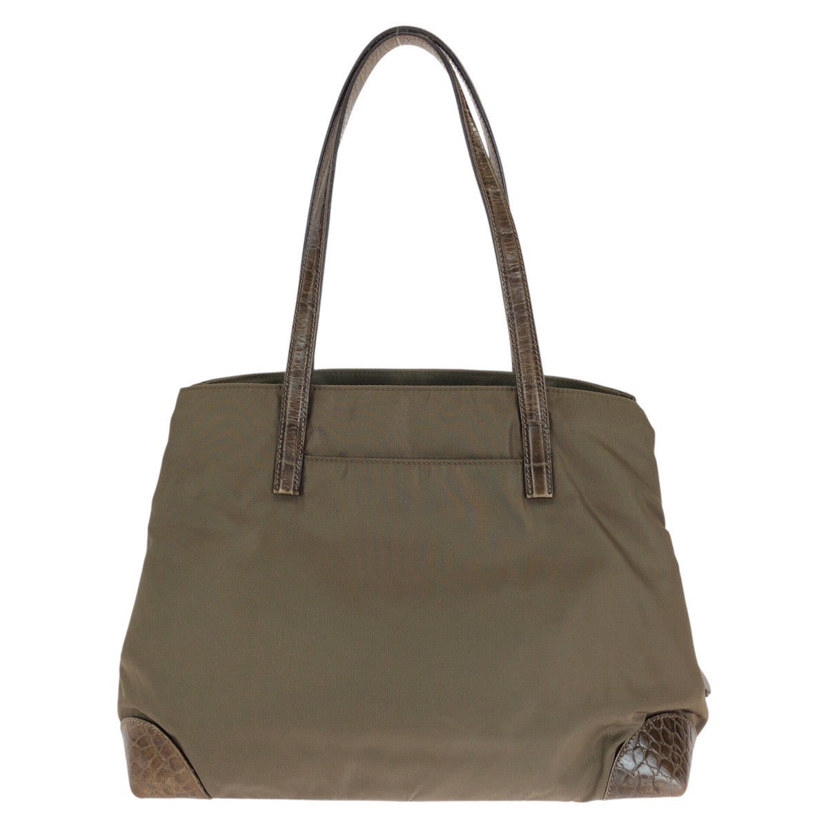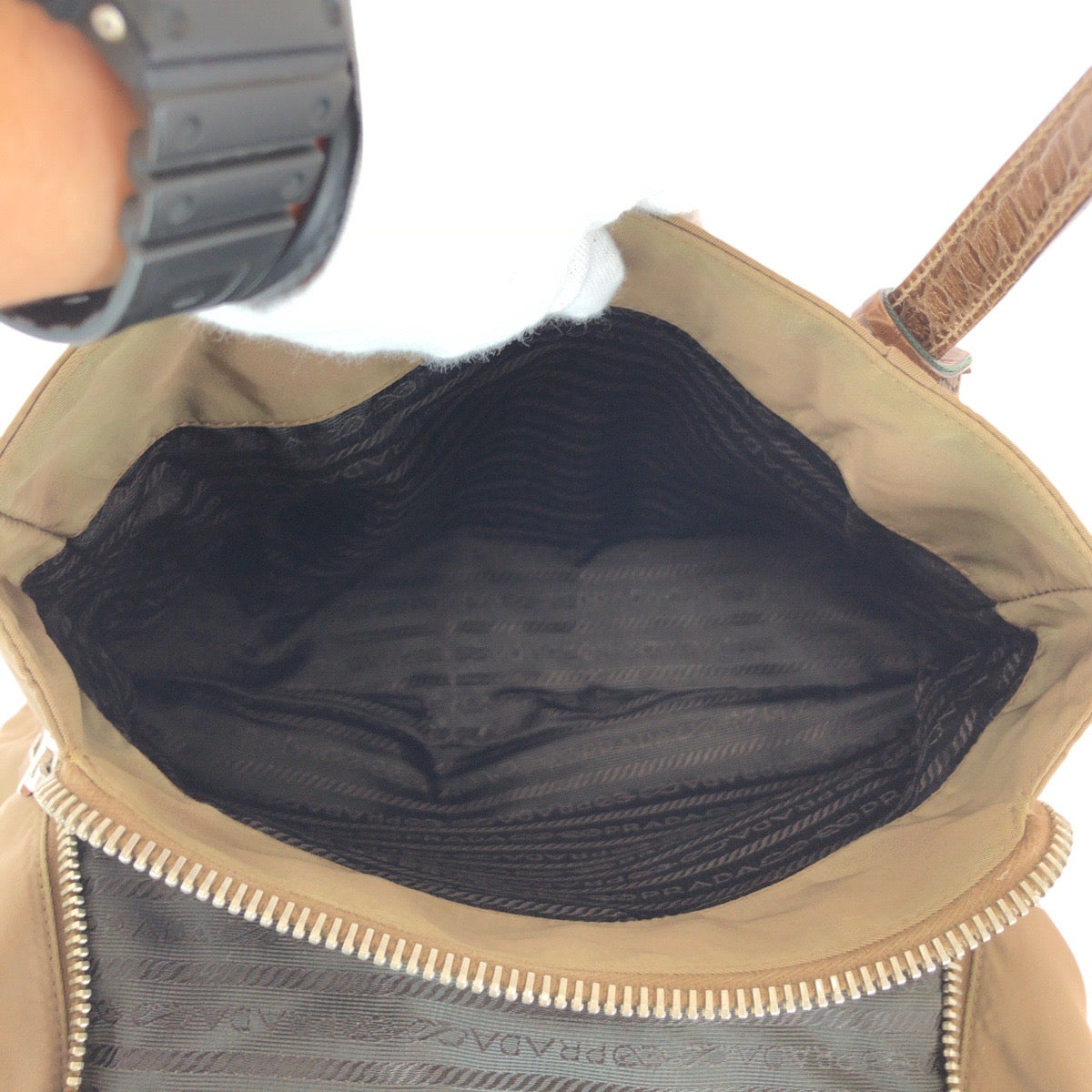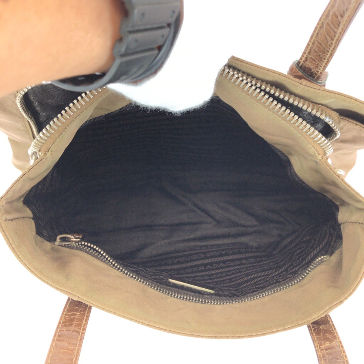PRADA Tote Bag Nylon, Leather Khaki Brown SilverMetal Tote Bag Shoulder Bag Test Triangle With logo Women Used Authentic