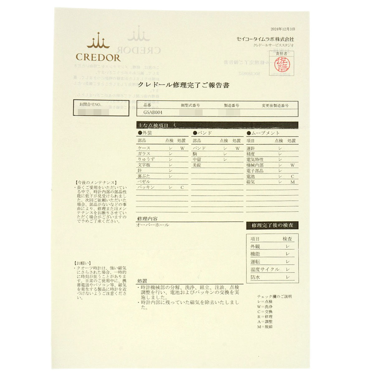 Accessories CREDOR Repair Completion Report